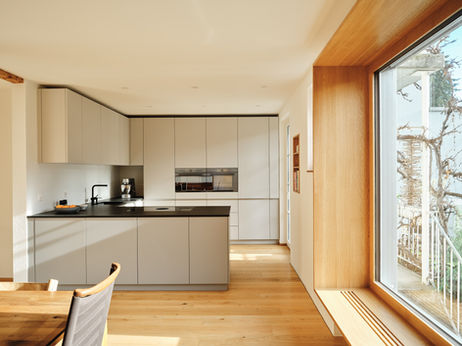 Im Erdgeschoss wurde die Raumstruktur neu konzipiert: Eine zeitgemässe Küchensituation schafft Klarheit und Grosszügigkeit im Grundriss. Ein neu eingefügtes Sitzfenster erweitert den Wohnraum zur Umgebung hin und verbindet innen und aussen auf subtile Weise. Die Materialisierung des gesamten Geschosses wurde neu konzipiert: Warme, natürliche Oberflächen schaffen eine ruhige und stimmige Atmosphäre.